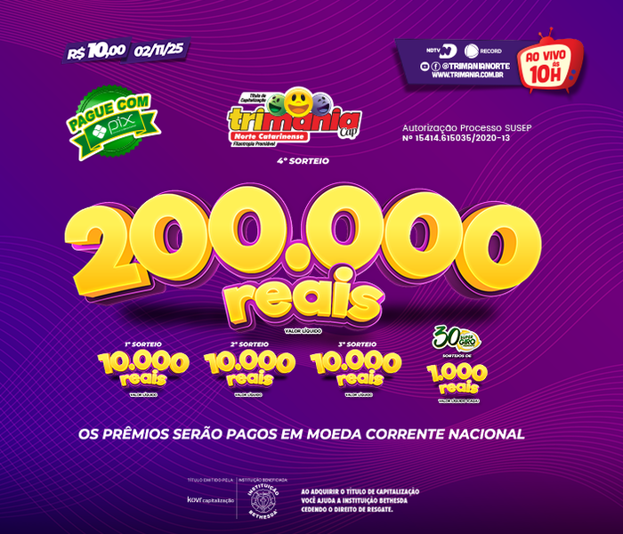 Juntos, o Trimania Norte e o HOSPITAL BETHESDA transformam esperança em ação, oferecendo a chance de concorrer a prêmios incríveis e, ao mesmo tempo, contribuir com a Instituição Bethesda que é uma entidade beneficente e filantrópica de assistência social preponderante na área da saúde.